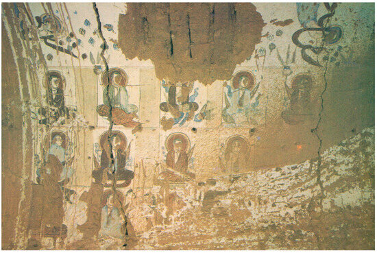Cave 20 has a rectangular floor plan with a vaulted ceiling. The space in the cave resembles the shape of a half cylinder horizontally stacked atop a cuboid. The entrance generally orients to the east. This cave features the best-preserved mural paintings at the site of Toyok, even though they are still in quite poor condition. All murals in Cave 20 were actually painted on high places of the cave, at least 1.8 m from the ground level. Most of the murals on the rear wall are no longer there. Only a few square units, defined by green frames, each with a tree-like motif flanked by two small lotus flowers, remain on the southern half (left side) of the wall (Figure 3). On the right half of the rear wall there is a huge tree, the crown of which is filled with flowers or fruits, amid which a serpent-shaped water column goes up and down. There is an apsara flying downward to the tree, with his right hand holding a tray. Under the tree, a monk-like figure is painted in the meditation posture, with flames and water emanating from his shoulders and legs.