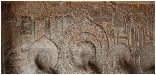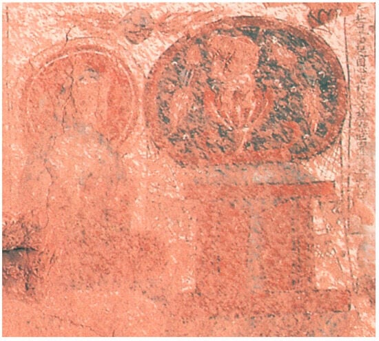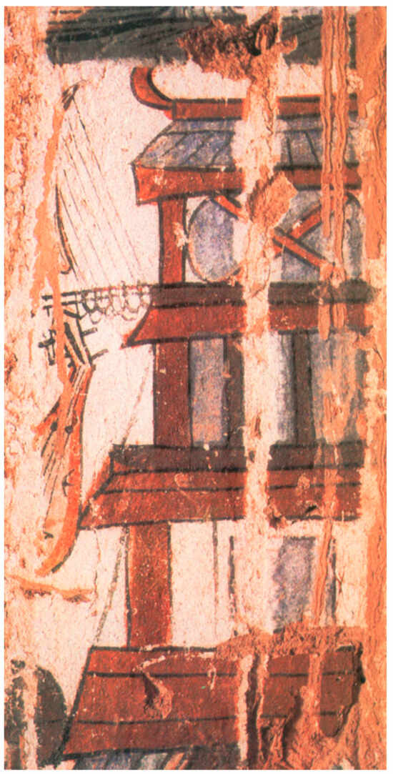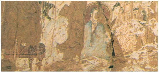 Though there is no textual evidence stating that this idea also existed in sixth-century Turfan, the image of the heavenly gate had been incorporated into contemporaneous Buddhist art at Dunhuang. The image of the heavenly gate with the iconography of paired gateposts (known as que) widely exists in the funerary art of the Han dynasty (202 BCE–220 CE), embodying the entrance to the Chinese Heaven above the axis mundi known as Mount Kunlun (Zhao 2023a, pp. 85–94). In fifth-century Dunhuang, this iconography was adopted to represent the entrance to [the palace in] Tuṣita Heaven dwelled by Maitreya Bodhisattva (see Figure 15).37 In a mid-sixth century cave at Dunhuang, a gate pavilion with both doors opening inward, very similar to the Toyok piece, was depicted as the entrance to [the palace] in Trāyastriṃśa Heaven, above Mount Sumeru, the Buddhist axis mundi (Figure 16) (see Shen 2023, pp. 4–13). Zhao Yi argues that early clerics in China identified Mount Sumeru with Mount Kunlun, Trāyastriṃśa Heaven with the Chinese Heaven (Zhao 2023a, pp. 99–103). It seems both the idea and motifs of the heavenly gate had already penetrated the Buddhist iconography.