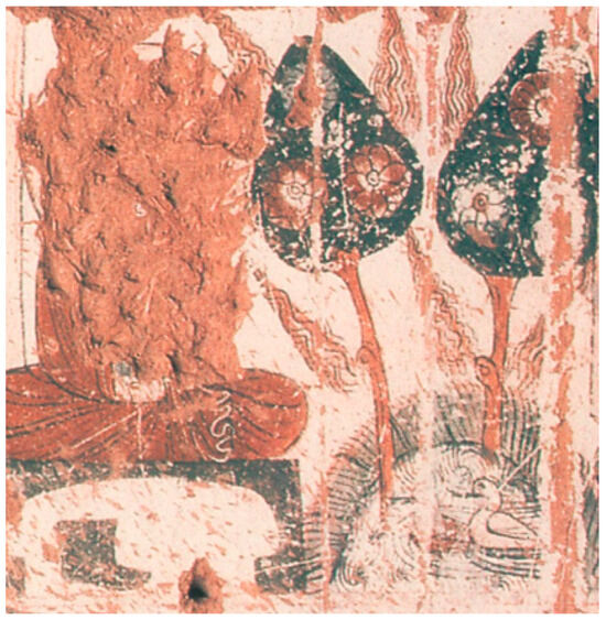 III. 3 depicts a tree with three flowers on its crown, flanked by two lotuses with radiating jewels on the top. More importantly, there are two flying pennants extending from the crown, seemingly blown by the wind to both sides of the tree. An inscription accompanies the images in III. 3, which can be translated as “the practitioner visualizes the tree leaves: each tree leaf (should be) contemplated as a hundred types of jewels; on the two sides of each tree, there are two jeweled banners”.17 The inscription corresponds quite well with the images in III. 3, especially in terms of the two flying banners extending toward both sides of the tree crown. Scholars have been unable to find a particular sentence in the Visualization Sūtra that matches this inscription. As mentioned earlier, the inscription in III. 2 also slightly varies from a similar sentence in the same sutra. Therefore, Ning Qiang suggests that there might have been a different version of the Visualization Sūtra circulating in sixth-century Turfan (Ning 2007, p. 137).