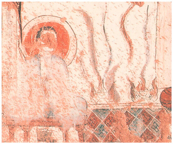 Though scholars generally agree that these mounted, meditating monks were created based on The Story of Sumāgadhā, the reason for painting this narrative of converting non-Buddhists to Buddhism in this Pure Land-dominated cave-shrine remains controversial. As part of his larger argument to connect various motifs in this cave with the Ocean Sutra, Yamabe considers that the creation of these mounted monks was informed by the motif of flying monks mentioned twice in the sutra (ibid., pp. 42–43). Miyaji simply considers it as a motif related to the general practice of meditation (Miyaji 1995b, p. 28). Building on this, Eric Greene views them as symbols of the miraculous power attained through achieving meditational concentration (samādhi) (Greene 2021, p. 104). The flame and water emitted from these meditating monks seem to support this idea, as depicting the emissions of flame and water from legs and shoulders was a common way to embody the miraculous power of a certain religious master, first seen in Gandhāran art.40 Not only those traveling disciples but also all the monk-like meditating figures painted in Cave 20 are depicted spraying fire and water, as well as with halos, which seem to emphasize the efficacy of meditation practices in the pursuit of gaining magical power and spiritual advancement. The Buddha also instructed on the magical power of controlling fire and water gained from the meditations of fire-king samādhi and water-king samādhi, respectively, in The Story of Sumāgadhā(Taishō, v.2, No. 128, p. 835). Ren Pingshan further argues that displaying the miraculous power acquired by performing Buddhist practices played an indispensable role in attracting followers of Buddhism (Ren 2015, p. 232).