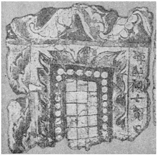 The images in II. 4 (Figure 12) are divided into two parts, separated by a horizontal, white plank. The upper section shows two white, hexagon-shaped gems that seem to be on fire and fuming. The lower section depicts a chessboard-like motif comprising various diamond-shaped units painted in red, blue and green. These diamond units are demarcated by alternating white lines. Within each unit, a diagram made of four small rectangles resembling the Chinese character “tian 田” is painted in ink. Depicting a chessboard-like motif was a common way to represent the beryl ground in Sukhāvāti in the Xinjiang area. Based on a similar wall painting collected by British archaeologist Aurel Stein (Figure 13) during his visit to the Toyok Caves in 1907, which features the inscription, “the meditation master visualizes the seven-jeweled ground”, Miyaji associates II. 4 with the third visualization, the Ground Visualization (Taishō, v.18, No. 365, p. 345).25 Of note, the Ground Visualization passage in the Visualization Sūtra is quite brief and void, stating that if you attain the state of samādhi (meditational concentration), you will see the ground so clearly and distinctly that it will be impossible to describe it in detail.26 A concrete description of the beryl ground is actually in the passage of the second visualization, the Water Visualization. It states, “On this beryl ground, golden paths intercross like a net of cords. The Land is divided into areas made of one or the other of the seven jewels, so the partitions are quite distinct”.27 The alternating white lines on the chessboard motif in II. 4 should represent those golden ropes on the beryl ground described above. The diamond units painted in different colors seem to refer to the seven jewels filling the beryl ground.