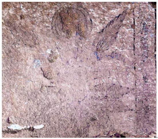 The badly eroded image in II. 6 seems to be related to the Ground Visualization. Although the images in II. 6 are barely legible now, fortunately, using an image-synthesizing technique that relies on digital means to integrate the different layers of images generated by visible lights, infrared light, ultraviolet-induced luminescence and visible-light-induced luminescence, Yamabe in collaboration with Academia Turfanica, enhanced the visibility of the devastated images in II. 6 (Taishō, v.18, No. 365, p. 345).30 Yamabe partially identified the inscription in II. 6 as “xingzhe [][][] chuang qing di”.31 The Water Visualization passage contains a related sentence that means “supporting the beryl ground from below are golden banners made of diamond and the seven kinds of jewels”.32 Based on the stereotype of the inscriptions observed in the previous part and the fragmented traces left on the wall, I suspect that this inscription might be “xingzhe guan qibaochuang qing di”, meaning “the practitioner visualizes the banners made of seven kinds of jewels supporting the (beryl) ground”.33