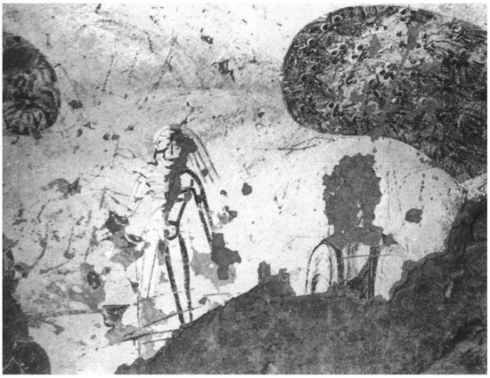 These are the only two images preserved in the bottom register of the right wall painting. I consider them evidence to argue that the bottom register depicts images facilitating the contemplation of the impure: a meditative practice centered on corpses and skeletons.44 The contemplation of the impure is an ancient type of meditation practice that originated in Theravāda Buddhism.45 Its key goal is to trigger the awareness that the attachment to oneself has to be forsaken. It reaches this goal by letting the meditators see the process of corpses decaying into bones, which thereby allows them to realize the impurity and impermanence of their own bodies. Furthermore, it teaches the practitioners to mentally peel off their skin, flesh, bones and organs, like peeling an onion, and thereby awaken to the truth that the ego, or self, does not exist at all, as it cannot be equated to any parts of the body being stripped. Later, it was incorporated into various meditation scriptures, including many Mahāyāna sutras. Scholars tend to associate the contemplation-of-the-impure images depicted in Toyok with three meditation sutras that are believed to have been compiled in the Turfan area: Secret Essentials, The Abridged Essence and the Ocean Sutra (see Yamabe 2002, pp. 123–43; also see Miyaji 2000, p. 281, and Greene 2021, pp. 75–94), which all feature instructions on visualizing corrupting bodies. To give an example, the Ocean Sutra provides instruction on how to meditate on the “Nine Forms of Corpse”, namely, fresh corpses, corpses with blue bruises, corpses with purulent blood, corpses with flowing crimson liquid, corpses being eaten by animals, corpses with only tendons connected to the bone, corpses with only detached bones, empyreumatic corpses and eroded bones turning into soil.46 The corpse painted on the western end could possibly be identified as a “corpse with blue bruise”, as it was intentionally painted in light blue. The other corpse on its right seems to represent a “corpse eaten by animals”, as we see a crow pecking the flesh from its right arm. It is hard to know whether the right wall once featured all nine forms of corpses taught in the Ocean Sutra, as most of the images on the bottom register no longer exist.
