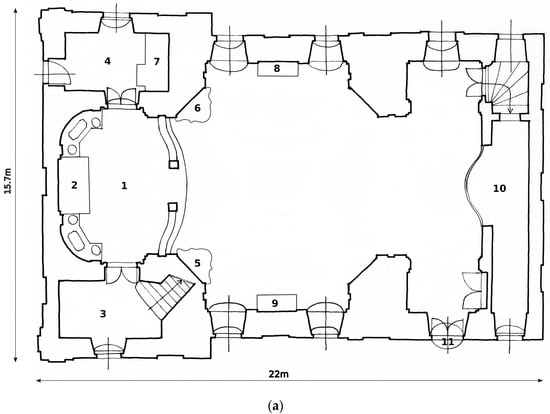 The principle of symmetry manifests itself even in the architecture of the chapel (Figure 2a). Although this is nothing exceptional in the case of sacred buildings, in our case, this principle is emphasized by unusually designed elements. These include, for example, a “double sacristy”, i.e., auxiliary rooms along both sides of the chancel, or the aristocratic oratory, situated opposite the chancel with the high altar. In terms of height, it is placed in a mezzanine, and its front part extends into the floor plan of the nave. Initially, it was a much more spacious room than it is now, where various valuable church items, vestments, paintings, and relics were kept. The elevated oratory, in vertical symmetry to the chancel, provided an imposing view of the church interior to the lords, and it enhanced the effect of symmetry more strongly than by looking from the ground floor of the nave. In the middle of the nave, the lords could view seven rows of pews, two side altars along the sides as pendants to each other (one dedicated to Saint Anthony of Padua and Saint Francis of Assisi, both highly venerated by the family), another pair of pendants behind them along the sides in the form of the pulpit and the organ, and two “sacristies” on the opposite side along both sides of the chancel, again as pendants: The functional sacristy on the left and the room with the organ console on the right (Figure 2b). Had a regular gallery organ been built in the chapel with the console under the prospectus instead of the pulpit organ, it would have been a simpler solution indeed, but it would have significantly disturbed the regularity and symmetry of the architecture of the whole chapel.