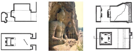 Long and narrow architectural plans gained popularity in the Xinjiang region. Specifically, Cave 38 at Kizil was designed without an antechamber or vestibule and is characterized by a barrel-vaulted ceiling with the entrance located on the narrower end. Over time, at Kucha and Kumtura, the main room’s back wall became flanked by arched passageways leading to a rear chamber, which is as narrow as a corridor. These passageways form a square unit that functions as a central pillar, although it does not house a pillared stupa. Instead, it features independent Buddha images set against simple arched niches or walls directly in view (Ho 1992, p. 61). This architectural choice likely represents the best solution within the technical constraints of wooden structures at that time. This method of construction may be seen as a precursor to techniques used in later cave monasteries such as Dunhuang and Yungang, marking a progression in excavation methods (Ning 2004; Kim and Han 2011). The initial five large grottoes at Yungang were typically designed with oval-shaped plans and domed, hut-like ceilings, resembling large modern yurts (Chang 2021). The common central pillar type seen in regions like Kizil, Dunhuang, Bezeklik, and Yungang, is usually situated at the intersection of two passageways along the lateral walls and extends to the rear wall, forming an ambulatory pathway [Figure 4].
