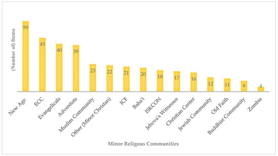 To examine the distinctions among smaller religious communities, whether they are Christian or non-Christian, we shall temporarily set aside the category of large Christian churches and direct our attention toward the Muslim population. Firstly, looking at the number of items each minor religious community was given, New Age communities stand out—perhaps surprisingly so (see Figure 1).