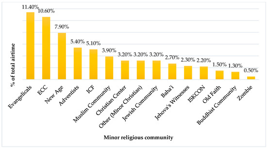 Comparing the percentage of total airtime given to minor religious communities. Evangelicals—Evangelical churches and communities; ECC—Evangelical Christian Church; ICF—International Christian Fellowship.