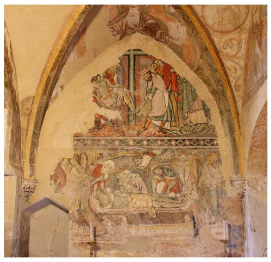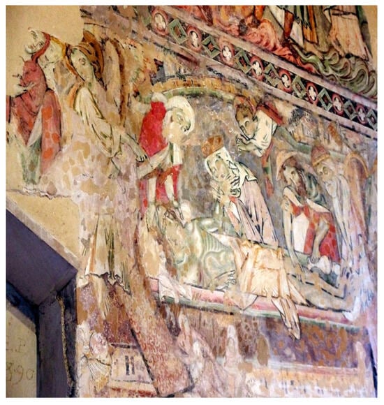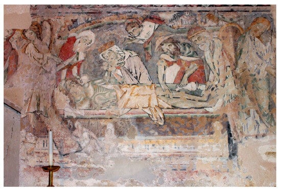 The deposition is on the upper register of the east wall and the Entombment combined with the Lamentation of Christ on the lower register (Figure 1 and Figure 2) (Park 1983; Oakeshott 1981; Flynn 1980, pp. 139–206; Lee 1975). In the upper scene, in the centre Christ’s body is lowered from the cross by, on the left, Joseph of Arimathea. Nicodemus, on the right, simultaneously removes a nail from his foot. Behind Nicodemus stands a mourning Saint John the Evangelist and, to the right, the remaining lower body of Mary Magdalene, the rest of her depiction having been damaged by the insertion of a 13th-century vault. The virgin’s body was also damaged and, on the left, just her hand remains on Christ’s shoulder.