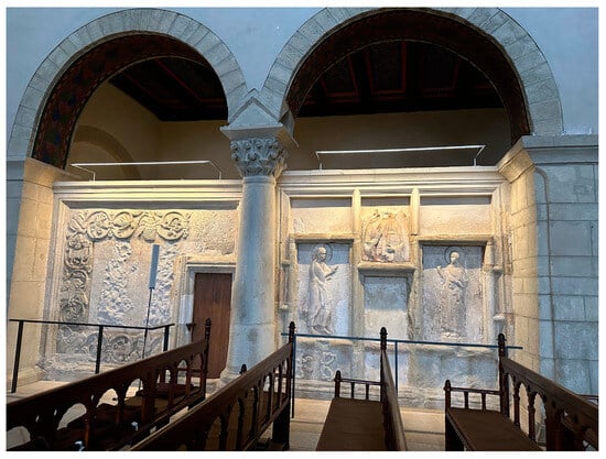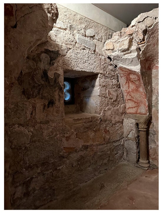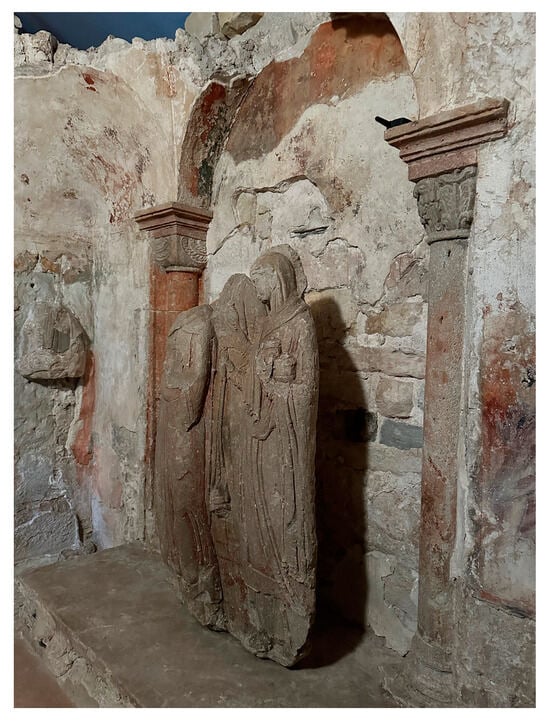 Around this time, in Gernrode, the site on the south wall representing Christ’s place of burial was moved and a sarcophagus or tomb bench was placed on the north wall of the burial chamber. The new position was in line with its position in Jerusalem (summarised in Schröter 2017, pp. 35–37; Krause 2007, pp. 253–56, Figure 141). The walls of the burial chamber each have a niche, bordered by columns with bases and capitals, which had supported a type of squinch that held the domed vault. This eight-sided vault was destroyed in the 17th century. This shape would have echoed the domed vault in Jerusalem.