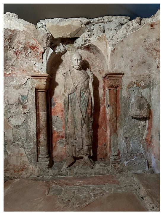 Adjacent to the north wall, on the floor, is a panel or base plate indicating where Christ’s sarcophagus was probably lain. Currently on this is a sculpture of the three Marys (Figure 7). They wear long robes and mantles and carry anointing vessels and their scrolls read ‘Surrexit non est hic’ and ‘nolite expavescere’, ‘he has risen, he is not here’ and ‘do not fear’ (Mark 16.6), (Schulze 1965, pp. 118–19). In the west niche there is also an over life-sized male figure (Figure 8). It has been suggested that he is a bishop, any of several saints or Christ resurrected, or that the sculpture was not originally part of the complex (the various views are summarised in Schröter 2017, pp. 47–55). In the first half of the 12th century the entrance from the east was also walled up and a new door made in the north wall of the antechamber (Krause 2007, Figure 143). This was due to the erection of a gallery over the eastern bay adjacent to the Holy Sepulchre.