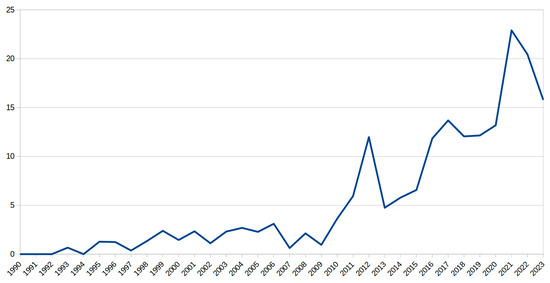 Of course, these absolute values (a) must be seen in relation to the total number of publications included in the database for each year (N). For this reason, the following diagram (see Figure 1) makes use of relative numbers, giving the frequency of occurrences in per mill, i.e., 1/1.000 (h).