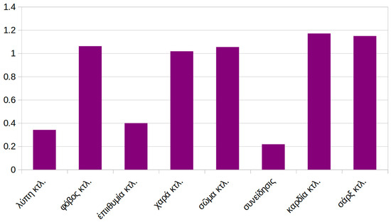 In fact, emotion language occurs frequently within the New Testament writings,5 some portions of which mention concrete sentiments or describe emotional dynamics that impact human interactions. Except for pleasure (ἠδονή), which appears in four places only,6 the other basic emotions of the Stoic system can be found more or less frequently in the New Testament. Pain (λύπη), fear (φόβος), and desire (ἐπιθυμία)7, as well as joy (χαρά), are just as present in these texts as other important key words of anthropological reflection, such as body (σῶμα), conscience (συνείδησις), heart (καρδία), or flesh (σάρξ).8 The below chart shows the word frequencies in occurrences per mill (see Figure 2).