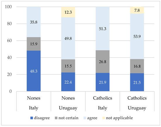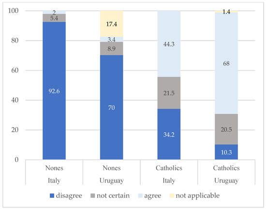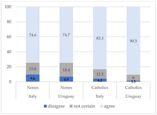 In terms of parents’ education (Table 4), it is possible to conclude that in the Italian case, the proportion of mothers of Nones who had a university degree is higher compared to that of mothers of Catholics (23.4% vs. 15.6%, respectively). Among fathers of Nones, we observed a similar trend for Italian samples: more fathers of Nones had university degrees (20.7%) compared to fathers of young Italians who defined themselves as Catholics (15.4%). For the Uruguayan sample, a higher percentage of mothers of Nones (68.4%) had university degrees (complete and incomplete) compared to mothers of Catholics (65.7%), although this difference is less discernible than in the Italian case. Instead, the share of fathers with a university degree among young people who identified themselves with Catholicism in Uruguay is slightly higher than the number of fathers with a university education among Nones. Even though this study does not directly compare Nones with minorities, it is evident that Italian Nones are more closely aligned with minorities than with Catholics when considering the proportion of their parents with a university degree.