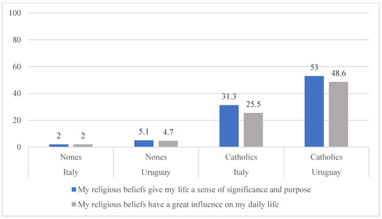 A significantly higher number of religious Nones and Catholics in the Italian sample tend to believe in and exercise religious practices compared to the young people in the Uruguayan sample.