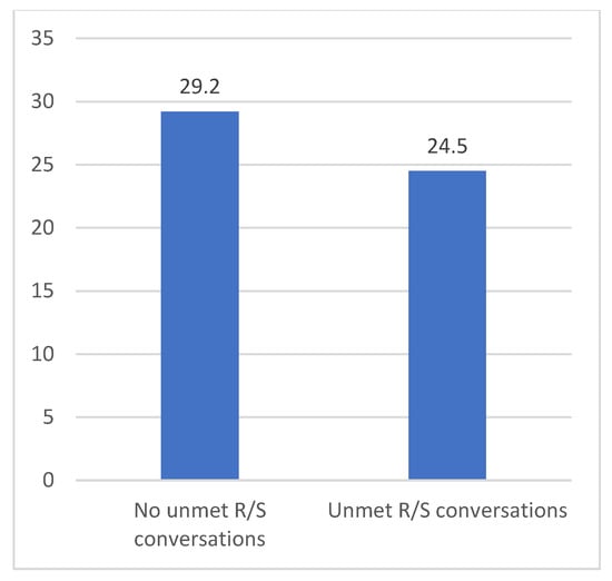 All types of unmet R/S care needs were significantly associated with the WAI as rated by patients, but not with the WAI as rated by caregivers (Table 4). The treatment alliances rated by patients and caregivers were also not associated, indicating significant differences in how patients and caregivers experienced the therapeutic relationship. The differences in scores of unmet R/S conversations (dichotomized in considering scores ≥ 1 as unmet R/S conversations) as experienced by patients are shown in Figure 3.