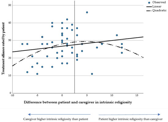The non-linear association between intrinsic religiosity was tested by including the quadratic term of delta intrinsic religiosity in the regression analysis. This analysis revealed a significant parabolic relationship between intrinsic religiosity and treatment alliance ( intrinsic religiosity = 0.39, p = 0.018; q intrinsic religiosity = −0.38, p = 0.021). An ANOVA analysis, in which groups were divided based on a score above or below the average of 8 in intrinsic religiosity, also showed a significant relationship (Table 6). Table 1 and Figure 4 show that the difference seemed most prominent in cases in which caregivers had higher intrinsic religiosity scores than patients.