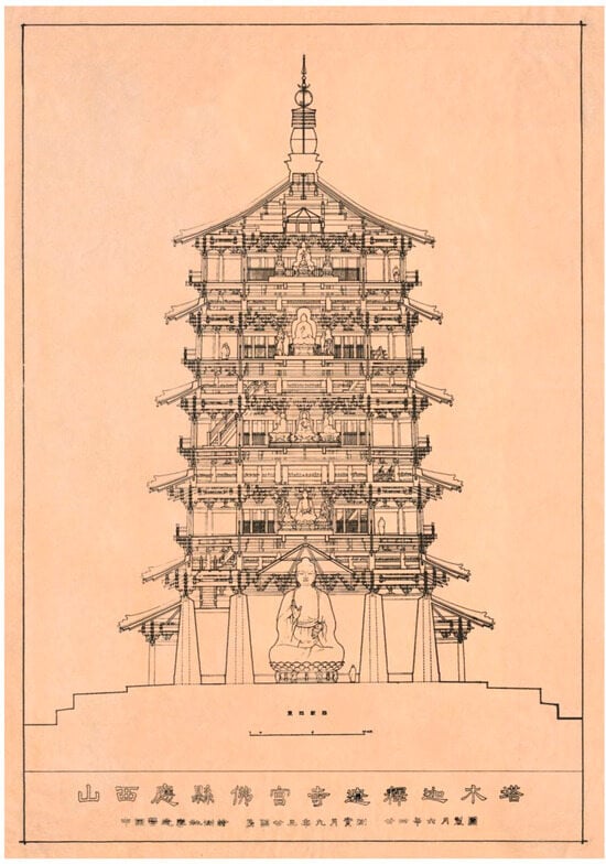 - Chen, Siliang, Mengzhe Yu, Xinyue Xu, Kaiyu Sun, and Chen Peng. 2023. Duo Mian Wei Fan Die Fo Hua Ta—Fogong Si Shijia Ta Yi Ti Hua She Ji Mo Shi ji Ying Zao Li Nian Tan Xi 度面為範 疊佛化塔—佛宮寺釋迦塔一體化設計模式及營造理念探析 (Using Buddha Statue’s Facial Length as Modular Measurement and ‘Stacking Buddha Statues’ to Construct the Pagoda: An Exploration of the Integrated Design Model and Building Philosophy for the Sakyamuni Pagoda of Fogong Temple). Jian Zhu Yi Chan 建築遺產 (Heritage Architecture) 2023: 65–76. [Google Scholar]