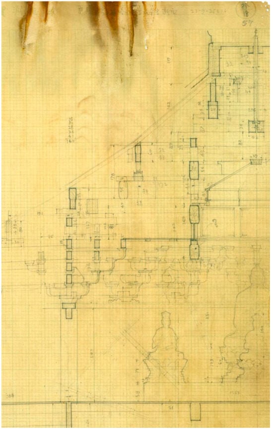 Building upon the preceding research, Chen Mingda 陳明達 conducted a comprehensive examination of the geometric proportions of the Pagoda of Fogong Temple, analyzing the construction from a holistic and detailed perspective, creating a paradigm in the study of the design methodology employed in ancient Chinese timber structures. In his seminal work, Ying Xian Mu Ta 應縣木塔 (Timber Pagoda in Ying County) (1966), Chen specified that the first floor of the pagoda reached a height of approximately 11 m. Extending the methodology of Liang and Mo, the section maps in the book depicted the statue complex collectively. Furthermore, Chen also conducted a preliminary exploration of the interior spatial composition of each floor ()4 (Figure 3).