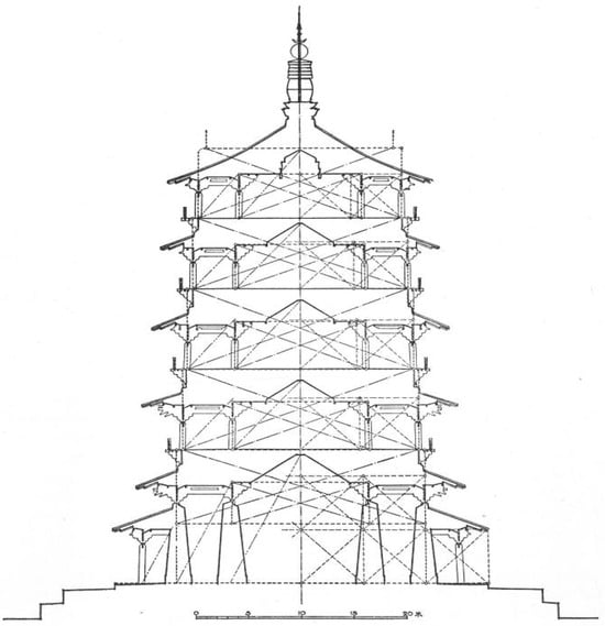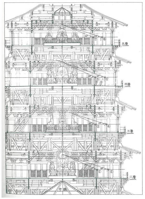 Section of the Pagoda of Fogong Temple. Source: China Academy of Cultural Heritage. (The Chinese character in the fiture says: Sakya Timber Pagoda of Fogong Temple in Ying County, Shanxi, mapped in September 1934 and drawn in June 1935 by the Society for Research in Chinese Architecture. The authors have obtained the copyright of the figure).