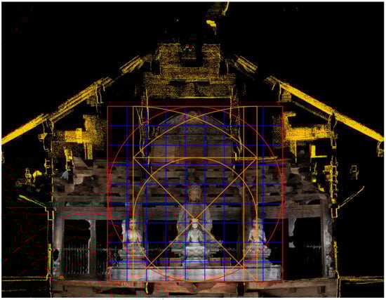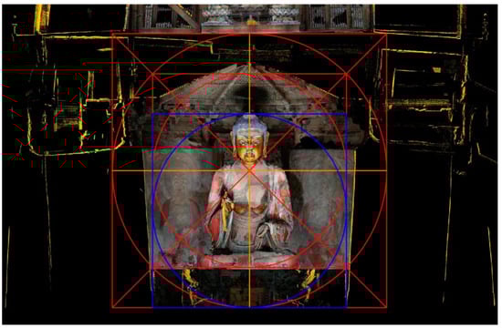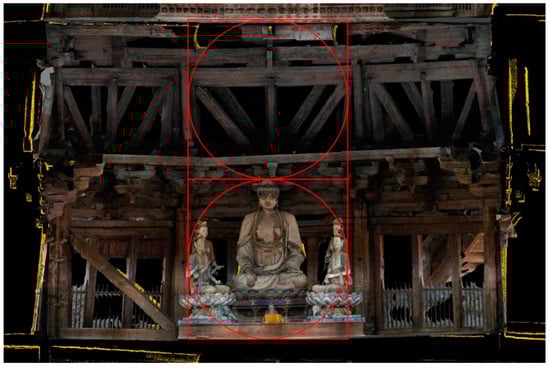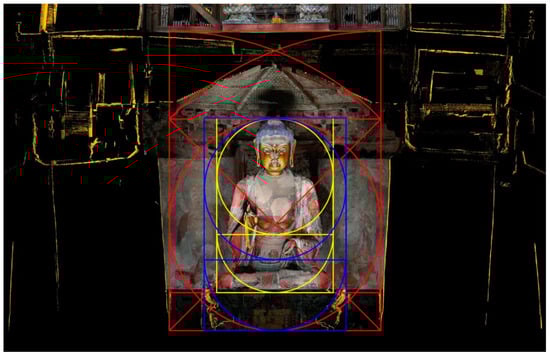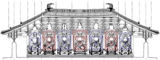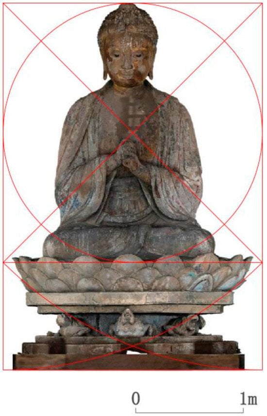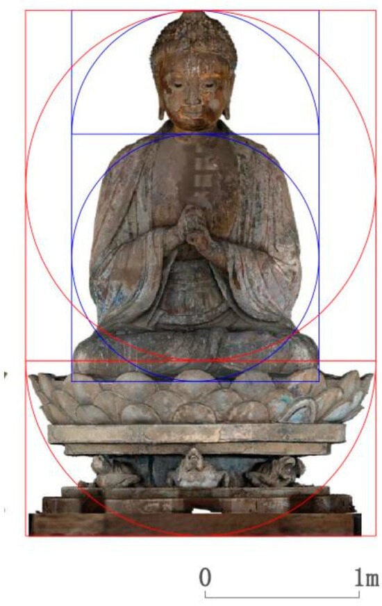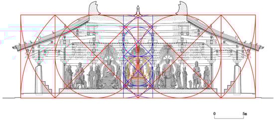 The author conducts an investigation of the geometric proportions linking architecture, interior space, and statues together. The study also encompasses diverse examples, including the Great East Hall of Foguang Monastery in Mount Wutai, the Guanyin Pavilion, and the Mountain Gate of Dule Monastery in Ji County, the Mahāvīra Hall of Fengguo Monastery in Yi County, the Mahāvīra Treasure Hall, and the Haihui Hall of Shanhua Monastery in Datong, the Bhagavat Sutra Hall of Huayan Lower Monastery in Datong, and the Dasheng Pavilion of Puning Monastery in Chengde. Notably, the examination focuses on ratios related to and /2 derived from the squared-circle map. This paper will introduce and elaborate on the design methodology termed “duo xiang gou wu 度像構屋”, which means designing the interior space of Buddhist architecture—such as halls, pavilions, and pagodas—in accordance with the principal statues (; ; ; ) (Figure 5).