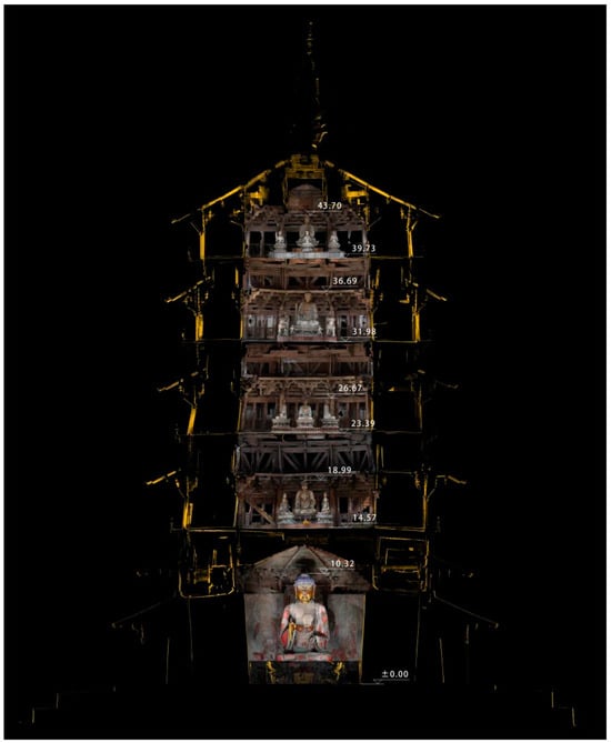 The pioneering investigation of the Pagoda of Fogong Temple and the statues was undertaken by Liang Sicheng 梁思成 and Mo Zongjiang 莫宗江. Their collaborative efforts encompassed a comprehensive examination, yielding a series of pagoda surveys and official sections, visually representing both architectural features and statues (see Figure 1 and Figure 2). Liang Sicheng’s paper, “Shanxi Yingxian Fogong Si Liao Shijia Muta 山西應縣佛宮寺遼釋迦木塔 (Liao Sakya Timber Pagoda of Fogong Temple in Ying County, Shanxi)” (completed in 1936), provides detailed insights. In this work, Liang highlighted the measured values, such as the approximately 12.30 m height of the Buddha on the first floor, the 4 m height of the two-story Buddha and its base, and the approximately 4.85 m height of the four-story Buddha.