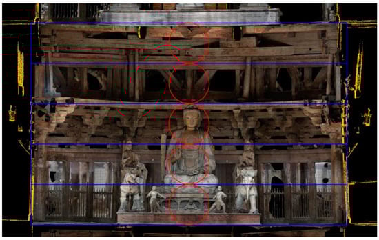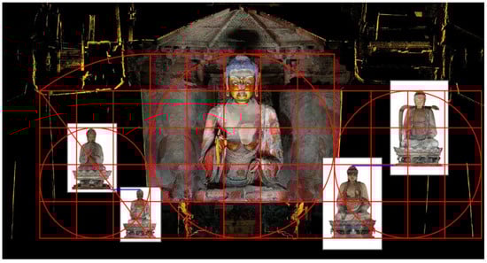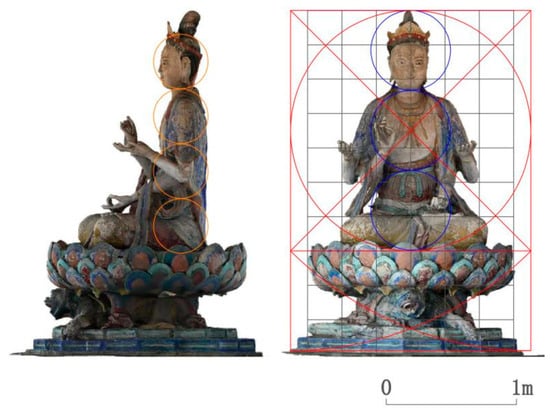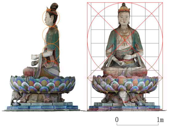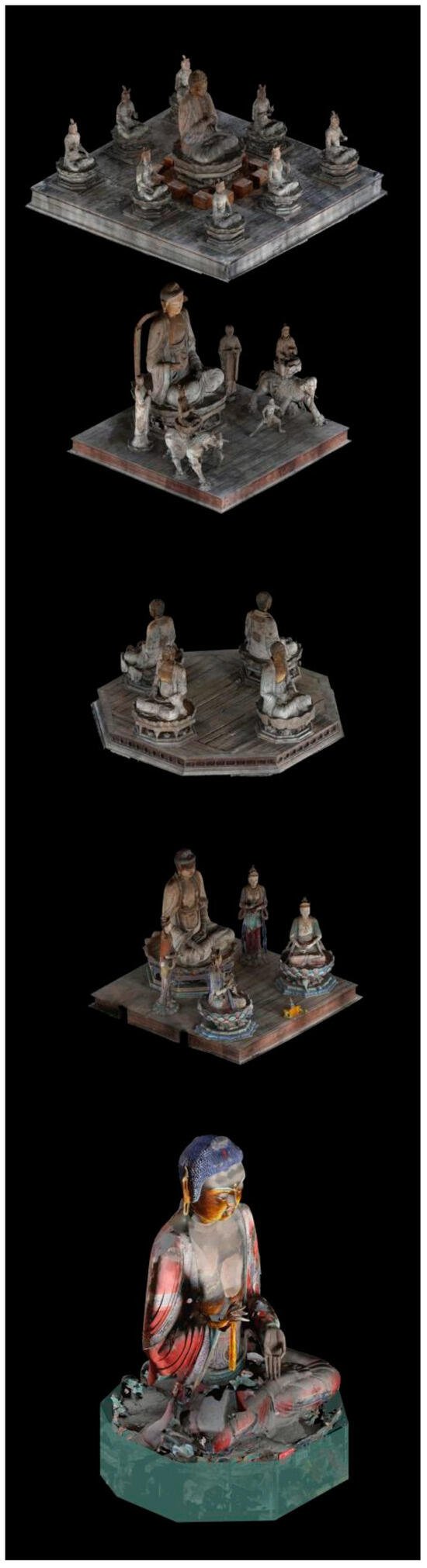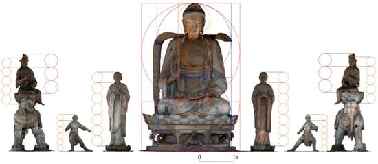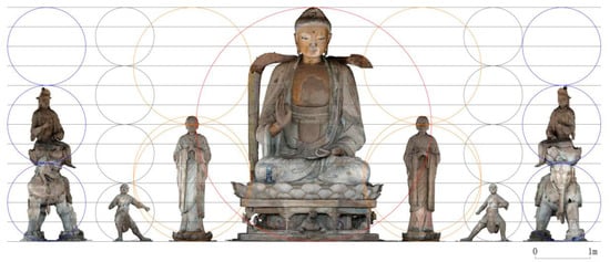 In the paper Yixian Fengguo Si Daxiong Dian Diaocha Baogao 義縣奉國寺大雄殿調查報告 (Investigation Report on the Mahāvīra Hall of Fengguo Monastery in Yi County, Liaoning), Ding Yao 丁垚 and Cheng Li 成麗 conducted a preliminary examination of the scale of seven statues through 3D laser scanning and mapping of the statue complex within the Mahāvīra Hall (). Similarly, in 2012 Shanxi Pingyao Zhenguo Si Wanfo Dian yu Tianwang Dian Jingxi Cehui 山西平遙鎮國寺萬佛殿與天王殿精細測繪報告 (Report on Fine Surveying and Mapping of the 10,000 Buddhas Hall and the Celestial Kings Hall of Zhenguo Monastery in Pingyao, Shanxi), Liu Chang 劉暢 et al. employed 3D laser scanning and color mapping techniques to analyze the standing and seated Attendant Bodhisattva statues situated on the east side of the 10,000 Buddhas Hall and the Celestial Kings Hall of Zhenguo Monastery. The study also briefly discusses the geometric proportions observed among the myriad Buddhas depicted in the mural ().