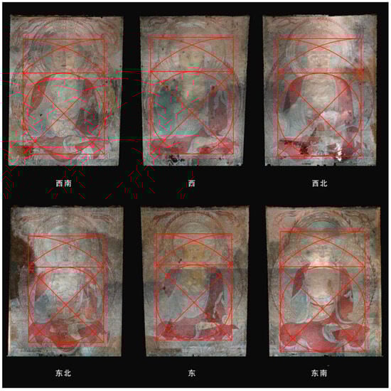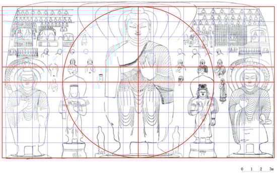 Geometric proportional analysis of the six Buddhas in the murals on the first floor Diagramed by the author.