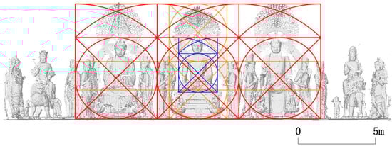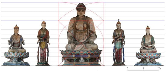 The total height of Buddha/the total height of the Attendant Bodhisattva/the total height of the Manjusri Bodhisattva ≈ 14:10:9. Therefore, the statue complex on the second floor has a clear proportional relationship in elevation design (Figure 15).