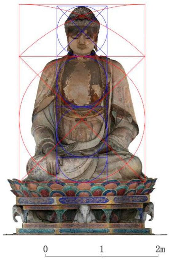 (2) Except for the Southeast Wall Buddha, the clear height-to-width ratio of the other five Buddhas is close to 7:5, that is, “fang wu xie qi 方五斜七 (square five, oblique seven)” (close to );10 (Figure 12). The average value of the total height-to-width ratio of the six Buddhas is close to 7:5, but there is a large difference among them; in contrast, the clear-height-to-width ratios are more unified.11