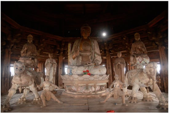 A square wooden Buddha altar is placed at the center of the second floor. On the altar, the Sakyamuni is sitting cross-legged at the center to the north, with two Attendant Bodhisattvas standing on both sides. The two Bodhisattvas sitting cross-legged on the two sides of the altar are Manjusri and Samantabhadra, respectively (which can be distinguished by the lion and elephant sculptures at the waist of the Sumeru seats) (Figure 13).