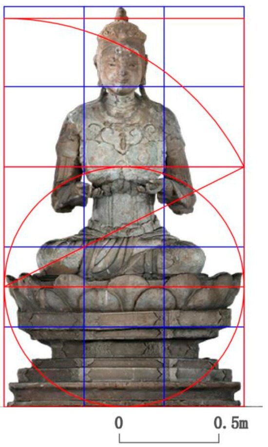 (1) The Total Height of Buddha (4.052 m)/the Total Height of Attendant Bodhisattva (average 2.936 m) = 1.38 ≈ 7:5 (98.6% coincidence, that is, “fang wu xie qi 方五斜七 (square five, oblique seven)”).