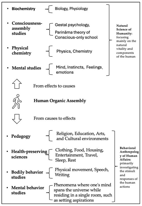 Building upon this foundation, Taixu proposed an Ideal Behavioral Science20 or, precisely speaking, an anthropology centered around human behavior, as presented in Figure 2.21 This Ideal Behavioral Science aimed to elucidate the various responses triggered within and outside the “human organic assembly” (人的有機團), a term encompassing the body and mind. Taixu criticized existing behaviorism for its incomplete coverage of human behavior, as it overlooked both the mental phenomena and numerous physiological phenomena. He advocated that the Ideal Behavioral Science should be based on the reality of the human body and mind, delving into the origins of present conditions and examining the impacts of the current behavioral stimuli. From effects to causes, this approach encompasses a range of disciplines: biochemistry (including biology, physiology, etc.), consciousness-assembly studies (including Gestalt psychology, the Parināma theory of Consciousness-only school, etc.), as well as physical chemistry and mental studies (including mind, instincts, feelings, emotions, etc.)—this aspect can be considered the natural science of humanity, focusing mainly on the natural vitality and components of the human. Conversely, from causes to effects, it leads to pedagogy (including religion, education, arts, cultural environments, etc.), health-preserving sciences (including clothing, food, housing, entertainment, travel, sleep, rest, etc.), bodily behavior studies (including physical movement, speech, writing, etc.), and mental behavior studies (phenomena transcending physical boundaries, such as setting aspirations). This aspect can be considered as the behavioral anthropology of human affairs, primarily exploring the stimuli and responses inherent in human actions. The Ideal Behavioral Science envisioned by Taixu is essentially a comprehensive study of all aspects of life, starting from human behavior, which is why he also referred to it as “philosophy of life”. In alignment with this all-encompassing research objective, Taixu believed that the methodologies of behavioral science should not be confined to the studies of observable behaviors, despite the validity of this approach. Beyond this method, Taixu proposed a range of investigative techniques, including introspection, questionnaire surveys (conducted across social, ethnic groups), discourse analysis, the analysis of individual inner experiences, hypnosis experiments, meditative observations from Samādhi, and the development of the power of knowing others’ minds (taxin tong 他心通) during the states of tranquility (śamatha) and insight (vipaśyanā). Moreover, Taixu particularly highlighted the power of knowing others’ minds—a skill that, when mastered by a sage of supreme wisdom, allows one to understand another’s intentions merely by observing their physical actions, without the necessity of verbal communication. Taixu believed that although this is not a typical psychological phenomenon; rather, it represents a more wholesome and elevated form of psychology, one that is accessible to all through dedicated practice.