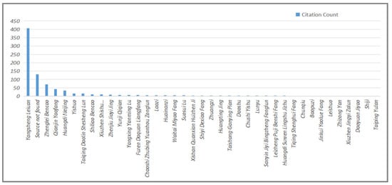 Furthermore, in addition to the Yangsheng Leizuan, Li Pengfei also excerpted from other works that possess unique scholarly value. When compiling, Li Pengfei directly indicated multifarious Daoism literature, such as Laozi 老子, Zhuangzi 莊子, Huainanzi 淮南子, Huangting Jing 黃庭經, Yinfu Jing 陰符經, Baopuzi 抱樸子, Jindan Jue 金丹訣, Siqi Tiaoshen Lun 四氣調神論, Tianyinzi 天隱子, Dongshen Zhenjing 洞神真經, Xishan Qunxian Huizhen Ji 西山群仙會真記, Xuanshu 玄樞, and others. Additionally, through database retrieval and verification, 270 citations were identified, involving nearly a hundred works, as shown in the figure below. It is worth noting that, from the following Figure 1, Sanyuan Canzan Yanshou Shu quotes more than 400 documents in the category of Yangsheng Leizuan, which becomes the main source of documents for the book.