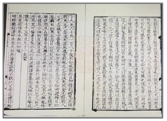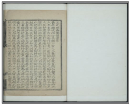 The Chenghua edition (Figure 6) is currently housed in the East Asian Library of Princeton University in the United States. It begins with Li Pengfei’s preface, followed by the table of contents. Before the main text, there is a section titled Renshuo 人說, followed by the five volumes of the main text, each corresponding in content to the Daozang version. The titles of the volumes are only listed with the book’s name, Sanyuan Yanshou Canzan Shu, and the volume number, without any author’s name, but there are readings and annotations within the text. Xie Jiong, who served as the magistrate of Qiantang during the Chenghua period in 1474, engraved and printed the Sanyuan Yanshou Canzan Shu, the Yangsheng Leizuan, and the Yangsheng Yuelan during his tenure. These publications were titled “Xiangong Jinshi 鄉貢進士 Qiantang 錢塘 County Magistrate 縣知縣 Qiaoyang 樵陽 Xie Jiong”. Princeton University’s East Asian Library houses all three of these books together in the same collection.