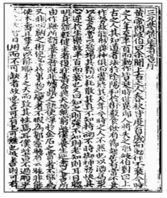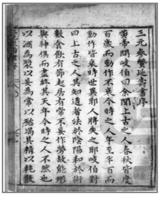 | 4 | Research on this book began as early as the 20th century. Since then, scholars have continually advanced in this field, delving into the concepts and methods of health preservation. In 1998, An Peiguo 安培國 analyzed the sexual health preservation concepts and methods in the Sanyuan Yanshou Canzan Shu (An 1998, pp. 184–86). In 2006, Ge Jianmin 蓋建民 analyzed the Daoist three primes longevity health preservation concepts and their modern significance (Ge 2006, pp. 31–39). In the same year, Chen Qingyou 陳慶優 analyzed the textual structure and ideological sources of the Sanyuan Yanshou Canzan Shu (Chen 2006, pp. 6–42). In 2014, Wang Yi 王怡 analyzed the virtue cultivation methods in the Sanyuan Yanshou Canzan Shu (Wang 2014, pp. 8–9). In 2018, Chen Dongliang 陳東亮 and Chen Yang 陳陽 analyzed the Daoist health characteristics in the Sanyuan Yanshou Canzan Shu (Chen and Chen 2018, pp. 56–58). In 2022, Song Xin 宋鑫 and Jiang Weiyu 蔣維昱 explored the tri-element health preservation concepts in the Sanyuan Yanshou Canzan Shu (Song and Jiang 2022, pp. 1042–45). |