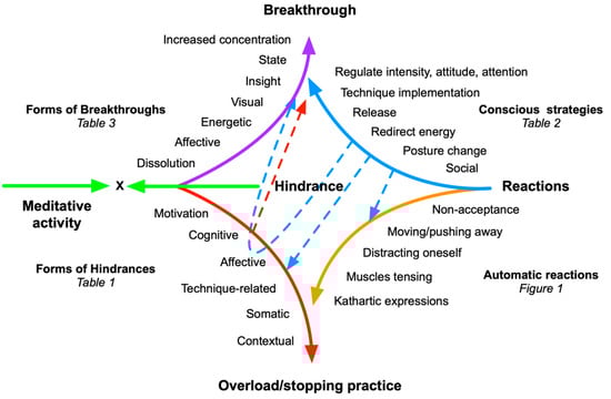 Overview of the relationships between the meditation activity, the hindrance, and reactions. “X” indicates the hindrance blocking the activity. Strategies that support potential breakthroughs and resistance move the participant towards overload and breaking off the meditation.