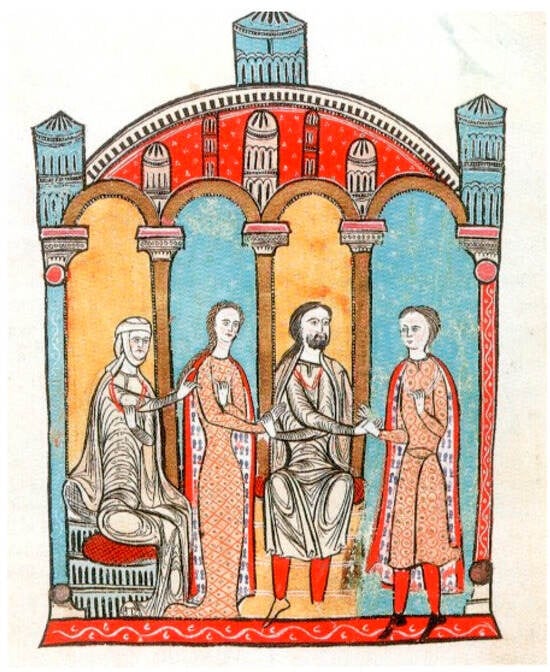 Starting from the legal, religious, and cultural background of the marriage ceremony, I would like to provide some examples of the ritual development outlined above, addressing the various aspects and stages of marriage and relating them to the associated visual representations. This can only be done by example and will not be exhaustive, due to the temporal and geographical dimensions of the topic. The first example stresses the importance of marriage for the transmission of wealth and the continuity of the family and the clan of the bride and bridegroom. Therefore, it represents the early medieval type of legal marriage, emphasizing the transmission of goods.