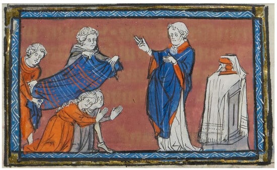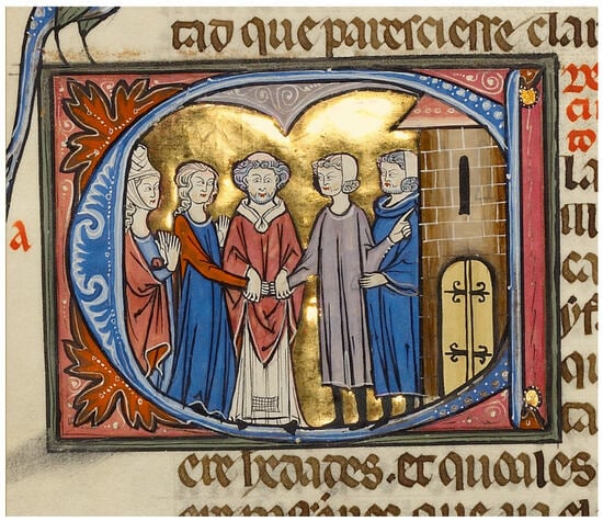 Sonne de Torrens 2021, p. 149). This focus on the exchange of consent by vows is represented repeatedly in the depictions of the marriage ceremony in manuscript illuminations from the legal and religious context.
