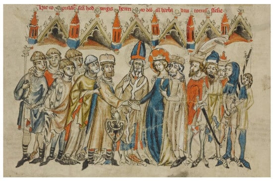 https://kdih.badw.de/datenbank/start, accessed on 9 August 2024). The HeidICON database of Bibliotheca Palatina at Heidelberg (Germany) provides 35 hits for medieval book illustrations related to marriage, mostly to the prose romance of Pontus and Sidonia from the Henfflin–Werkstatt, originally from France but translated later into middle-high German in the middle of the 15th century.