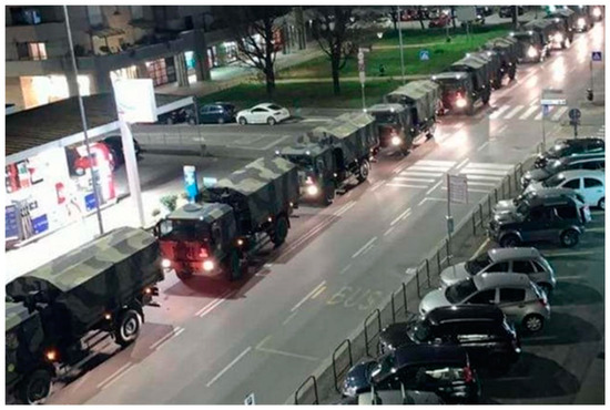 The first image, in chronological order, portrays a column of military trucks carrying the coffins of those who died from COVID-19 in Bergamo and could not be buried in the city’s cemeteries (see Figure 1).
