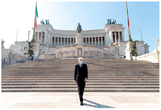 President Sergio Mattarella stood alone on the scene in a deserted city, without cars or people, without his entourage, without celebrations, and without any sign of the presence of the state (such as a parade with eminent representatives of the institutions). There were no sounds or noises and no people participating on either side of the street. The monument Altare della Patria (Altar of the Homeland) stood out as a second silent actor, confirming that the invisible virus made the cities visible in their pure objectivity.