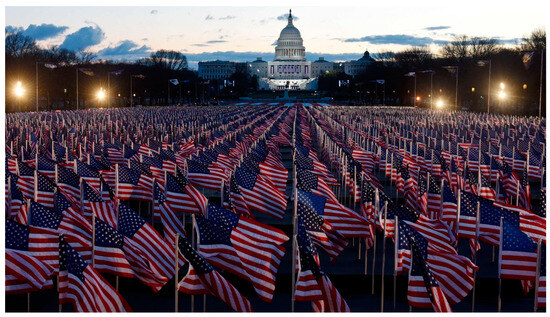 The audience was represented only by a sea of stars-and-stripes flags that filled the clearing of the White House (see Figure 3): 100,000 flags were placed, one for every person who died of COVID-19.