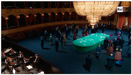 La Traviata was performed in Rome. The Opera Theatre lacked an audience, with no symbols aimed at representing it. The orchestra—directed by Daniele Gatti—was scattered all over the theatre, loges included. The scenic movements occupied the entire place, from the stage to the parterre and the loges. Vocalists, extras, the choir and the orchestra played in order to turn the whole theatre into a stage. The distinction between actors and audience was repealed; everything was play (Figure 4).