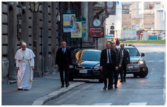 In fact, the “extraordinary ritual” was the second act of the narration. The first (on 15 March) was the silent and lonely pilgrimage to the crucifix in Saint Marcello al Corso, which is believed to have already rescued Rome from a pandemic, in a deserted and silent city of Rome. That same crucifix—a powerful and silent presence—would be placed in Saint Peter’s Square on 27 March (see Figure 7).
