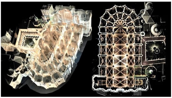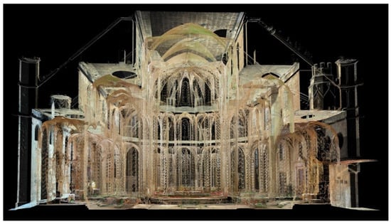 Classical historiography assumes in the scholastic context that the Gothic cathedral is the manifest result of the will of two parties: that of the promoter and that of the builder. The interaction between both figures was highlighted by Wilhelm Worringer (1881–1965) in the Formprobleme der Gotik (Worringer 1911) and by Erwin Panofsky (1892–1968) in Gothic Architecture and Scholasticism (Panofsky 1951). Otto von Simson (1912–1993) initially tackled the question of learned sources (Simson 1952, pp. 6–16), seeking them in Augustine of Hippo’s De Civitate Dei, De Ordine, and Musica, and further developed them in The Gothic Cathedral: The Origins of Gothic Architecture and the Medieval Concept of Order (Simson 1956). Methods utilizing indirect records such as close-range photogrammetry (CRP) and terrestrial laser scanning (TLS) (Figure 2) allow for a precise analysis of the three-dimensional space, enabling the examination of points that were previously inaccessible and allowing them to be contrasted with these historiographical theses.
