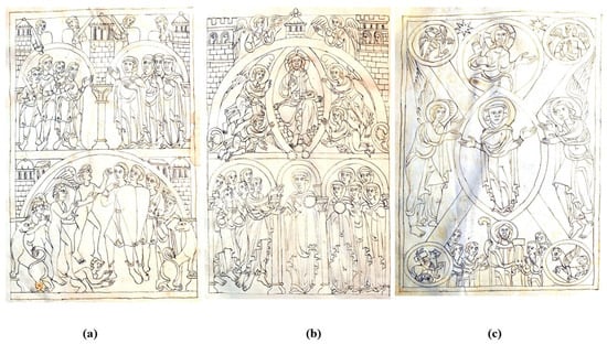 ACTo No. 20, 12th century. (a) fol. 1v, Defense of the City of God; (b) fol. 2r, Celestial Jerusalem; (c) fol. 2v, Maiestas Mariae. Image authors granted reproduction permission.