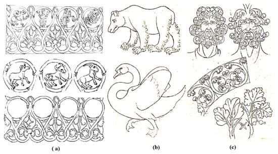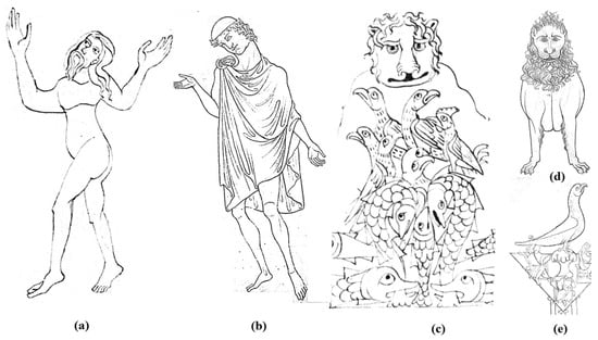 On the other hand, the architectural layout of the illustrations of the City of God and Celestial Jerusalem (Figure 4a,b) brings us closer to the collection of graphic representations of architecture in the Livre de portraiture (c. 1220–1240) by Villard de Honnecourt (c. 1200–c. 1250) from (BnP, Ms Fr 19093), which consists of 33 parchment folios (0.230 × 0.240)12. Likewise, the vegetal forms and the bestiary depicted in the Zodiac (ACTo 20 fol. 1r) in the representations of Aries, Taurus, Leo, or Capricorn (Figure 5a) bring us closer to the bear and the swan, a figurative representation of Celestial Jerusalem from (BnP, Ms Fr 19093, fol. 4r) (Figure 5b). The têtes de feuilles and the vegetal ornaments (BnP, Ms Fr 19093, fol. 5v) (Figure 5c) bring us closer to the scrolls alternating with foliar motifs, which are symmetrical and heart-shaped motifs from (fol. 1r). The human figures of the Creation of Adam and Eve (Figure 6a) bring us closer to those in (BnP, Ms Fr 19093, fol. 29v) (Figure 6b), an ancient representation of Mercury; to the birds and marine animals of the creation of the fifth day and the terrestrial ones of the sixth day (Figure 6c); and to the lion (BnP, Ms Fr 19093, fol. 24v) (Figure 6d) and eagle for reading the gospel (BnP, Ms Fr 19093, fol. 7r) (Figure 6e).
