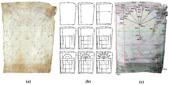 (a) Parchment Mostra d’En Antony Guarç, ACTo Factory—No. 49; (b) graphic transcription of the parchment’s auxiliary lines; (c) metric of the apse layout.