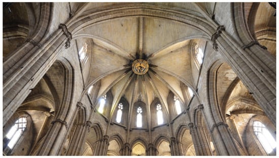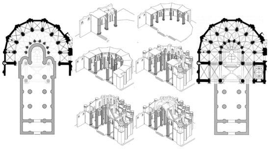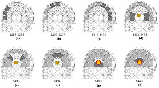 The apse with a double ambulatory was built between 1374 and 1441, embracing and replacing the previous Romanesque cathedral from the outside. The first phase (1383–1424) involved the construction of the belt of radial chapels, executed in a sequential manner (Figure 9a–c). The second phase determined the construction of the ambulatory (1424–1434) symmetrically covering the axis of the presbytery (Figure 9d–f), which is balanced on the pilar major (Figure 9d). Finally, the closure of the presbytery (1435–1441) occurred with the first placement of the keystone on the main pillar (1439) (Figure 9g) and the subsequent construction of the vaults (Figure 9h).