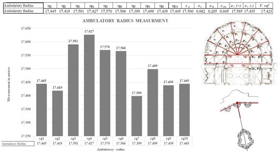 The total width of the ambulatory is the statistical value of the inner face of the enclosing wall, obtained as the most probable value ca(rg1–10 = 17,500 m) with a root mean square error of the mean (ccm = 0.065 m), resulting in an interval [17.565–17.435 m] within the reference value (17.423 m), which is equivalent to 75 spans (Figure 10) (Appendix A, Table A1 and Table A2).